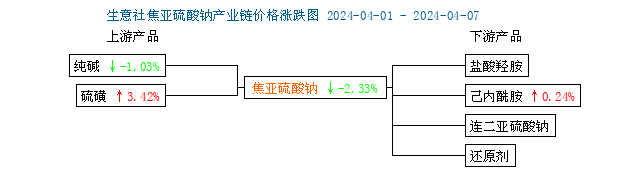 截至4月7日,國內(nèi)純堿價(jià)格偏弱運(yùn)行,整體下跌1.03%,硫磺價(jià)格小幅回升,整體上漲2.80%,綜合來看,原料成本整體仍處低位,純堿價(jià)格跌幅有所放緩,原料成本震蕩前行,后市焦亞硫酸鈉價(jià)格弱勢(shì)有望企穩(wěn)。